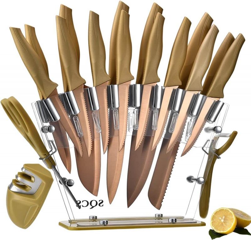 In summary, the SQCS Gold Blade Knife Set is a comprehensive collection of knives with a stylish gold finish, suitable for a variety of cutting needs, and comes in a conveniently sized package.